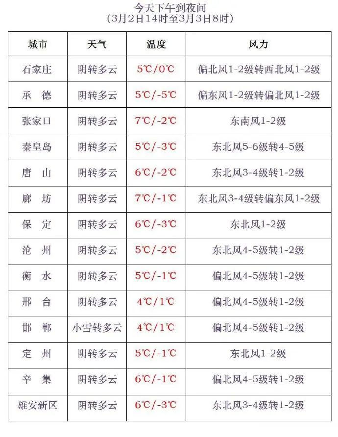 今天下午到夜間,保定西部、石家莊西部、衡水南部、邢台西部和南部、邯鄲陰有雨夾雪或小雪轉多雲,局地有中到大雪,其他地區陰轉多雲。最高氣温,張家口北部、承德北部、保定西北部-2~2℃,其他地區3~5℃。最低氣温,張家口北部、承德、保定西北部-15~-5℃,其他地區-4~1℃。