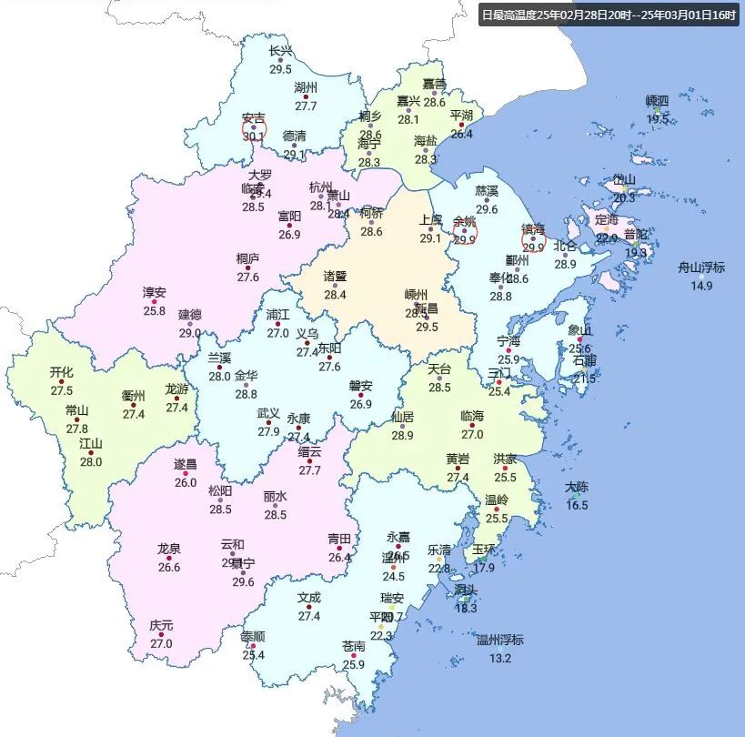 浙江全省最高氣温大部25-29℃,
