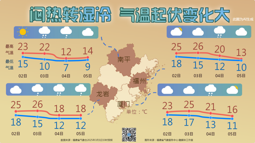 據福建氣象,4日起受冷空氣影響,全省氣温將明顯下降,最低氣温降幅可達7℃~10℃,局部12℃。4日~9日,中北部地區將出現3天~6天日平均氣温連續低於12℃的低温陰雨天氣。