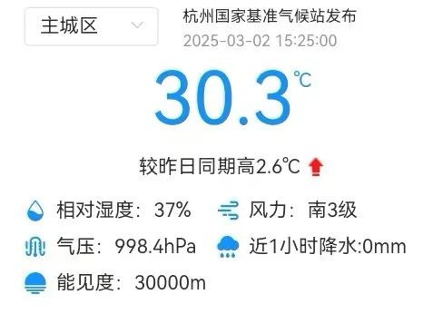 今天,杭州的最高氣温在15時25分達到了30.3℃,直接熱到破紀錄!但冬春之交不合情理的大回暖,往往是大降温的前兆,杭州天氣將迅速“變臉”。