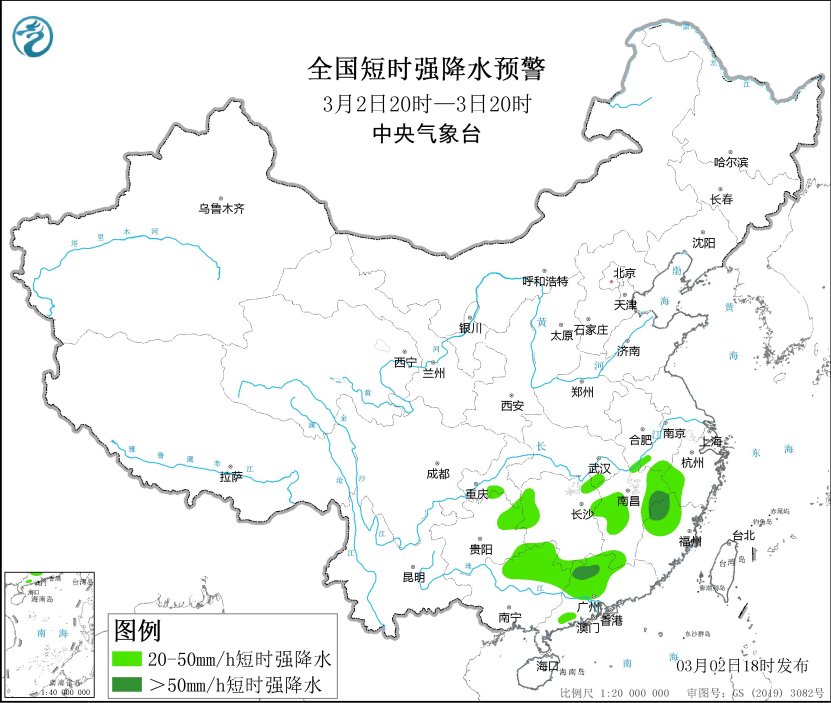預計3月2日20時至3日20時,貴州東部、廣西北部、湖南北部、安徽南部、江西中東部、浙江西部等地的部分地區將有8級以上雷暴大風或冰雹天氣,局地風力可達10級;貴州東部、廣西北部、湖南北部和南部、江西大部、福建西北部、浙江西部等地的部分地區將有小時雨量大於20毫米的短時強降水天氣,其中,廣東北部、福建西北部、江西東部等地的部分地區小時雨量大於50毫米。