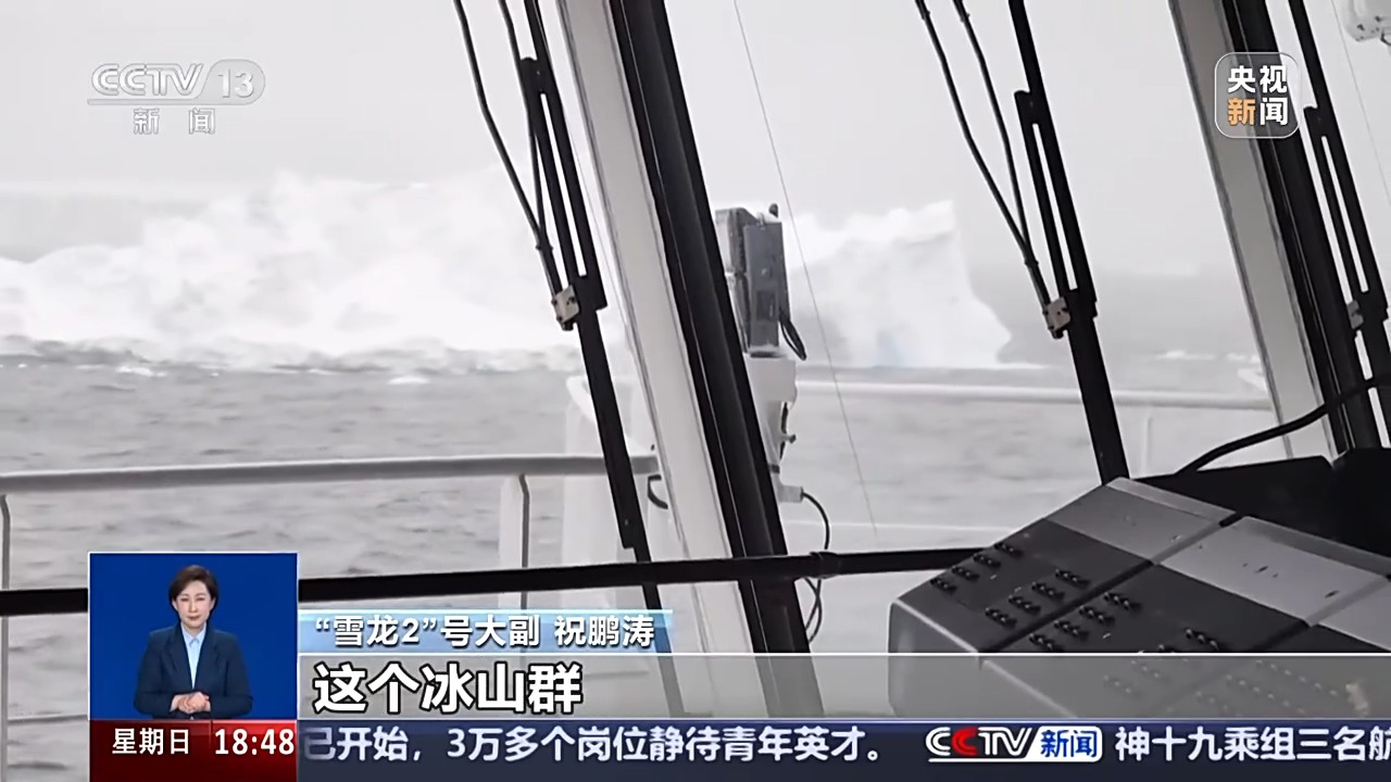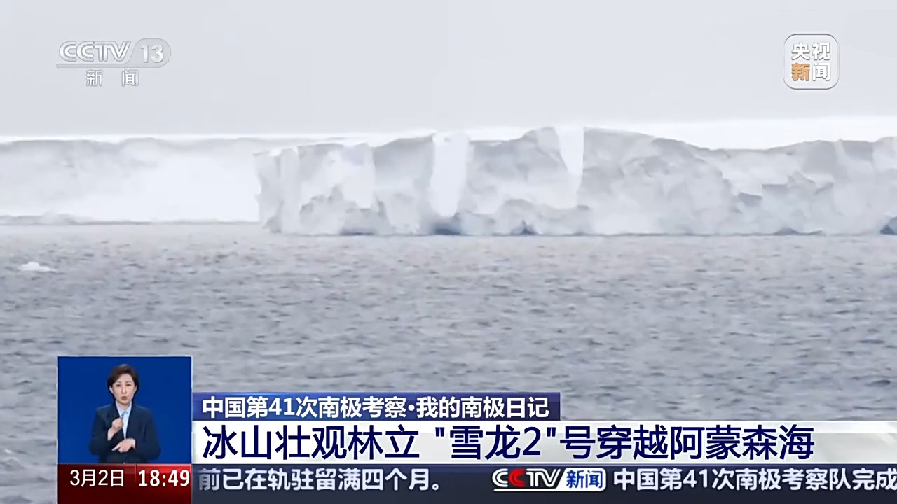 *總枱央視記者 王楠:*這裏是“雪龍2”號極地科考破冰船,目前我們正航行在南極阿蒙森海上,大概的位置是在南緯70度、西經130度附近,户外温度降到零下2.8攝氏度。從船上向四周看去,可以看到冰山的數量越來越多,僅在船的左舷,就能數到七座大冰山。