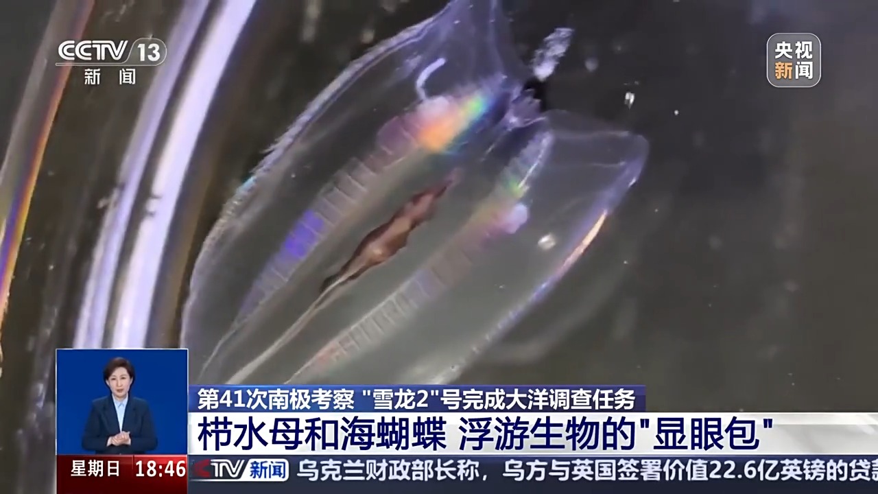 在捕撈上來的浮游動物中,有不少“顯眼包”。這個會發出五彩光芒的叫櫛水母,這個像長耳兔一樣不斷扇動翅膀的叫“海蝴蝶”,而這個有着一對薄翼般翅膀的生物,有個好聽的名字,叫作*“海天使”*。在冷藏櫃中,記者看到了“海天使”的真身。