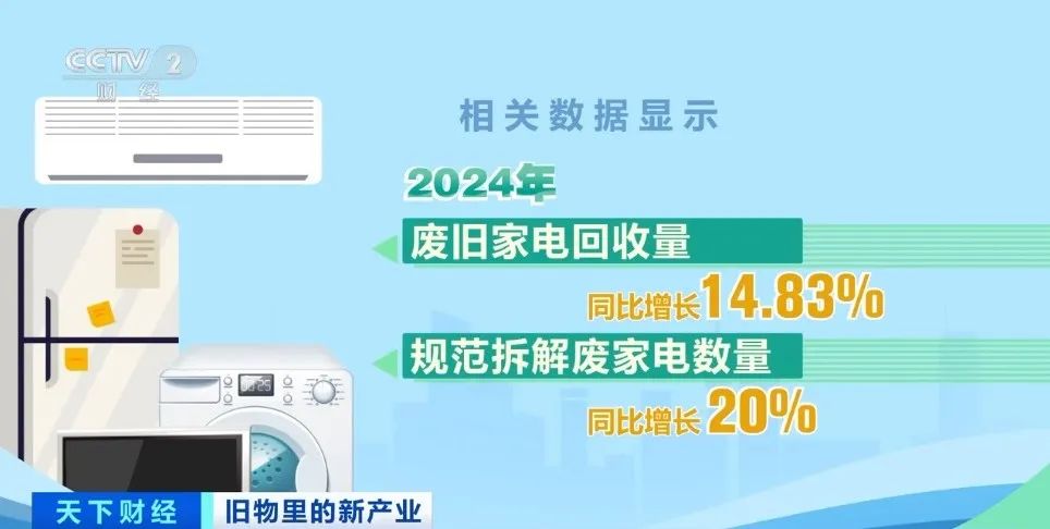 相關數據顯示,2024年廢舊家電回收量同比增長14.83%,規範拆解廢家電數量同比增長20%。