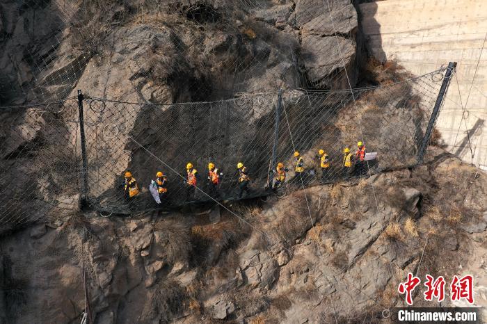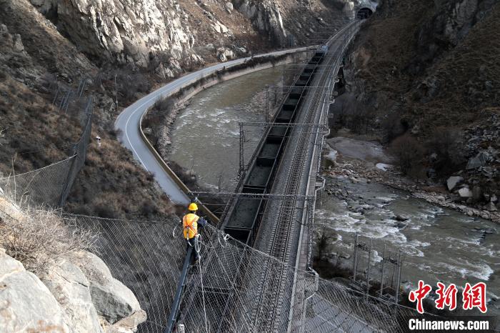 2月28日,青海省海東市樂都區老鴉峽,中國鐵路青藏集團公司西寧工務段橋隧工沿着被動防護網巡檢。中國首條通往青藏高原的鐵路——蘭青鐵路從老鴉峽穿行而過,為防止峽谷兩側山石崩落,危及列車行駛安全,搜山掃石成了橋隧工的重要任務。(無人機照片) 張忠蘋 攝