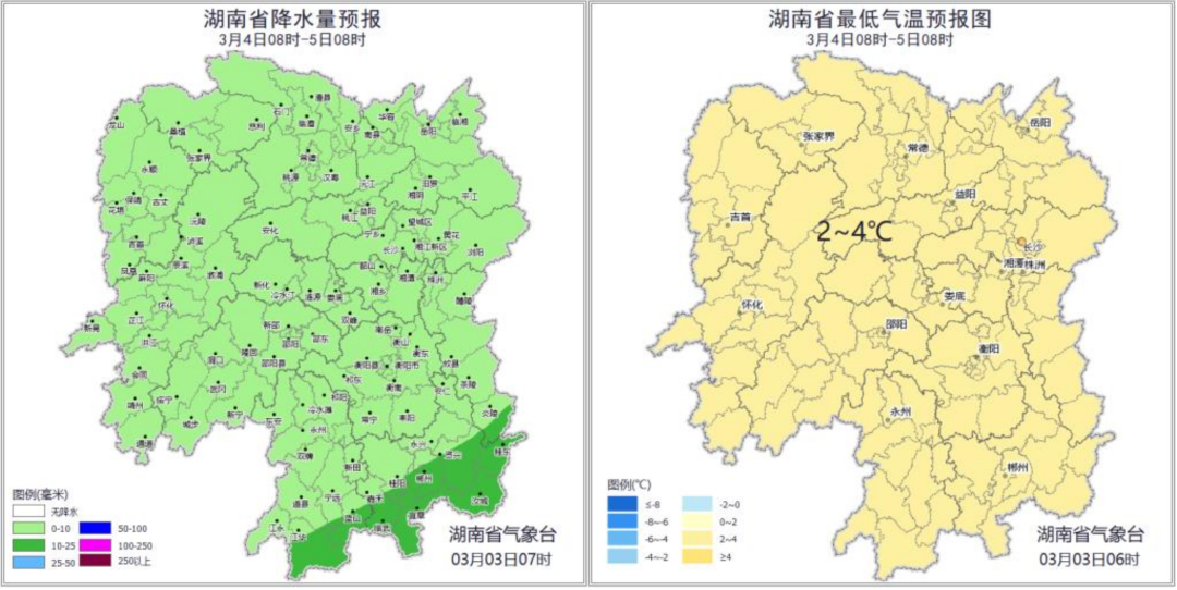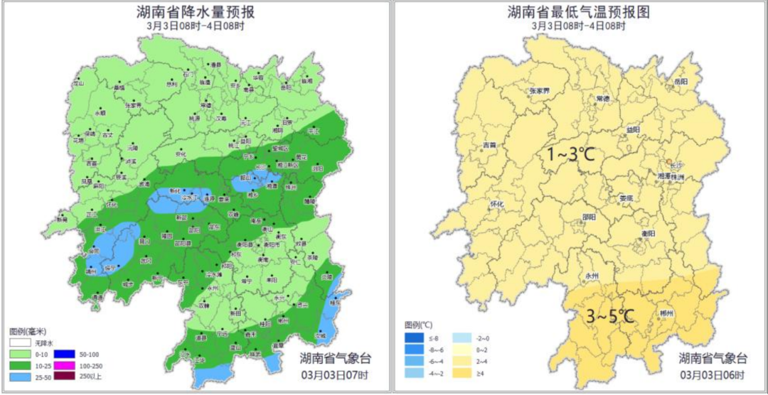 3月3日白天到晚上,湘中以南陰天有小到中雨,局地大雨,並伴有冰雹、雷暴大風等強對流天氣,其他地區小雨轉陰天,湘北高海拔地區有凍雨或雨夾雪;北風3~4級,局地陣風6~7級;最低氣温湘中以北1~3℃,其他地區3~5℃;最高氣温湘南20~22℃,其他地區9~15℃。