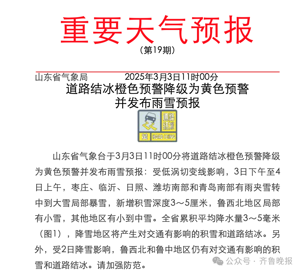 道路結冰橙色預警降級為黃色預警。受2日降雪影響,魯西北和魯中地區仍有對交通有影響的積雪和道路結冰。請加強防範。