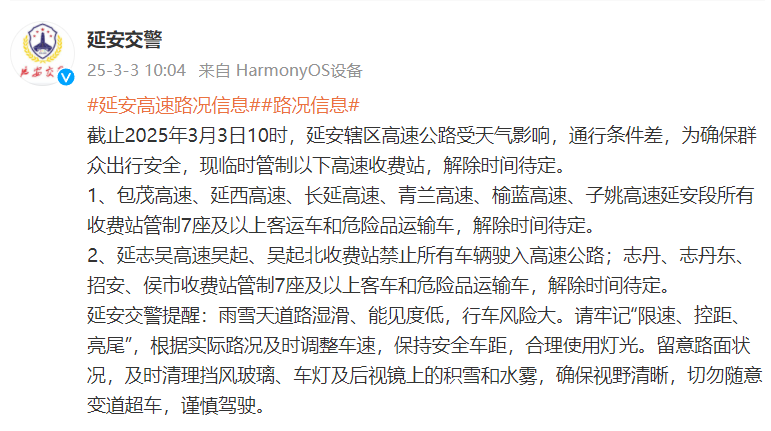 截至2025年3月3日10時,延安轄區高速公路受天氣影響,通行條件差,為確保羣眾出行安全,現臨時管制以下高速收費站,解除時間待定。