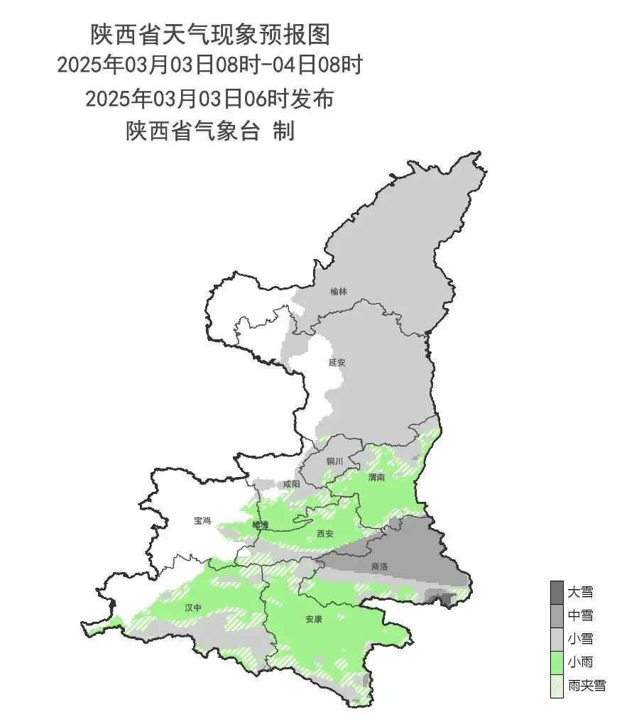 預計3月2日10時至3日10時,*陝北中西部、關中北部部分、秦嶺山區有中到大雪(3~10毫米),局地有暴雪(10~13毫米)。*降雪主要時段在2日夜間至3日白天。新增積雪深度:陝北西部、關中北部局地、秦嶺西段2~5釐米,局地8釐米以上,陝北東部、秦嶺山區東段0~3釐米。