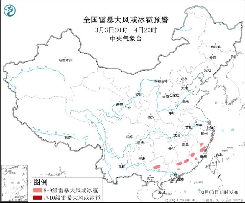 預計3月3日20時至4日20時,江西南部、浙江南部、福建西部和北部、廣西東北部、廣東中北部等地的部分地區將有8級以上雷暴大風或冰雹天氣,局地風力可達10級;江西南部、浙江東部和南部、福建、廣西北部、廣東等地的部分地區將有小時雨量大於20毫米的短時強降水天氣,局地小時雨量可達40毫米以上(見圖3)。中央氣象台3月3日18時繼續發佈強對流天氣藍色預警。