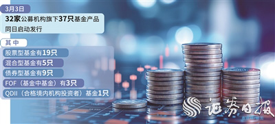 在3月份的第一個交易日,公募基金市場迎來產品集中發行。3月3日,32家公募機構旗下37只基金產品同日啓動發行。Wind資訊數據統計顯示,集中發售的37只基金中,股票型基金有19只,混合型基金有5只,債券型基金有9只,FOF(基金中基金)有3只,QDII(合格境內機構投資者)基金1只。
