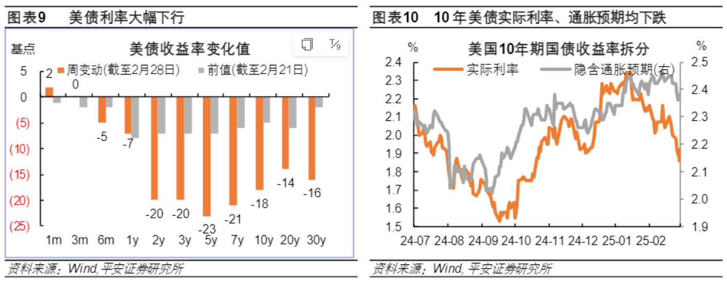 平安證券也分析提到,美國1月PCE物價數據符合預期,但地產、個人消費支出等數據走弱,降息預期升温,助推美債收益率大幅下行;兩年期美債利率整週大幅下行20BP至3.99%。10年美債收益率整週下行18BP至4.24%,10年TIPS利率(實際利率)整週下行14BP至1.86%,隱含通脹預期整週下行4BP至2.38%。