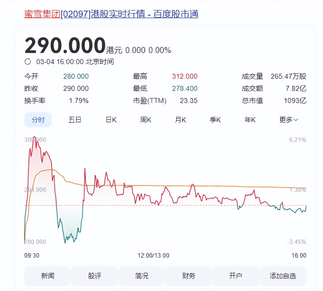 此次蜜雪集團發行價為202.5港元/股,開盤即大漲30%,盤中最高漲幅超過47%,最終以290港元/股收盤,較發行價上漲43%。這一漲幅不僅打破了新茶飲行業的“破發魔咒”,也使得蜜雪集團的市值躍升至1093億港元,成為今年港股新股中唯一一家市值突破千億規模的公司。