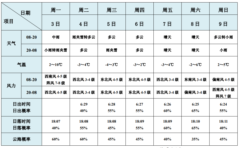 景區氣象:今天白天多雲轉雨夾雪,西北風4到5級,氣温-3到5℃,今天日落時間18時08分可見概率45%;可見雲海。森林火險1級。
