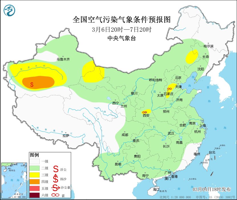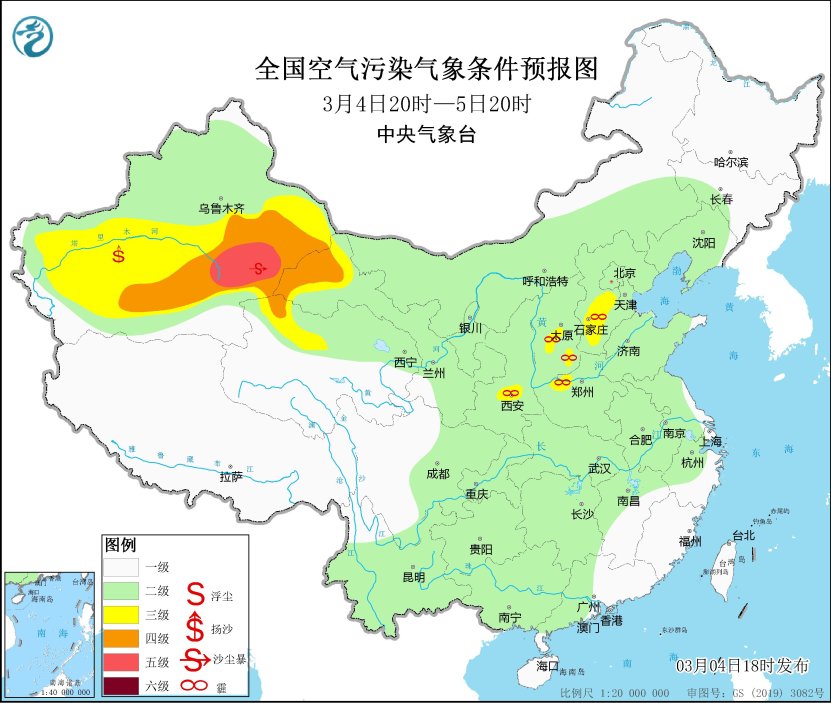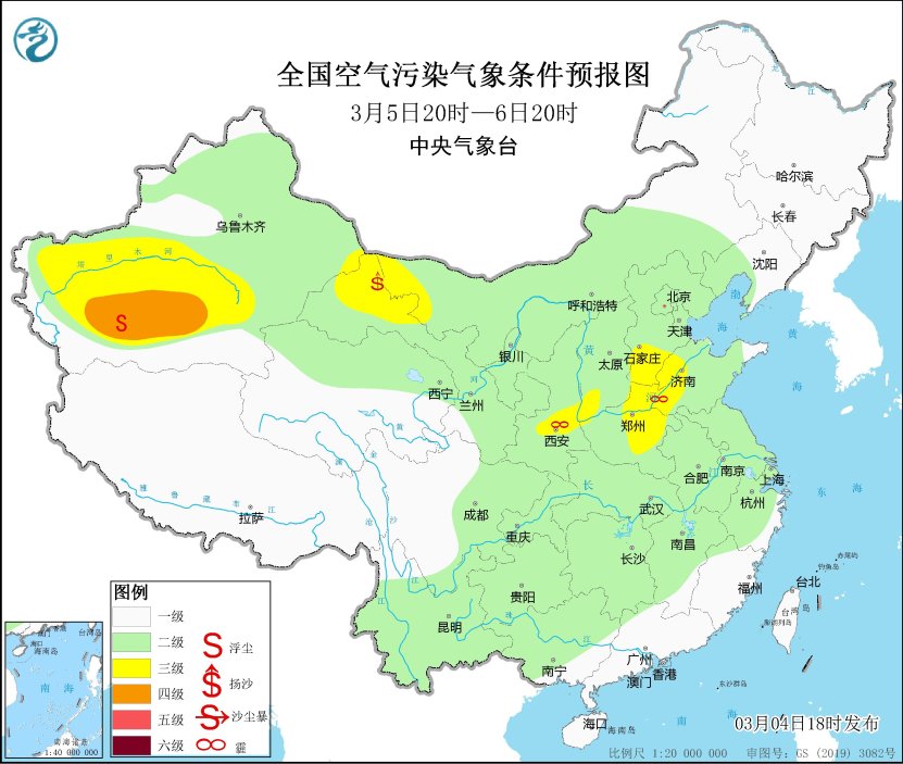 4日夜間至5日,新疆南部和東部、甘肅西部、青海西北部等地的部分地區有揚沙或浮塵天氣,新疆南部和東部局地有沙塵暴。4日夜間至5日白天,華北中南部、黃淮等地大氣擴散條件轉差,部分地區有輕度霾;5日夜間起,受冷空氣影響大氣擴散條件逐漸轉好;7日至10日,華北中南部、黃淮等地大氣擴散條件再次轉差,有輕至中度霾。此外,4日夜間至5日上午,河北東部、山東北部等地的部分地區有大霧天氣,局地能見度不足200米。
