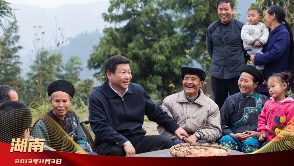 2013年11月3日,習近平來到湖南省湘西土家族苗族自治州花垣縣十八洞村。在苗族貧困村民施齊文家中看望時,習近平坐下來同一家人算收支賬,詢問有什麼困難、有什麼打算,勉勵一家人用勤勞和智慧創造美好生活。隨後,習近平同村幹部和村民代表圍坐在一起,親切地拉家常、話發展,聽村民們談變化、講困難、道實情。