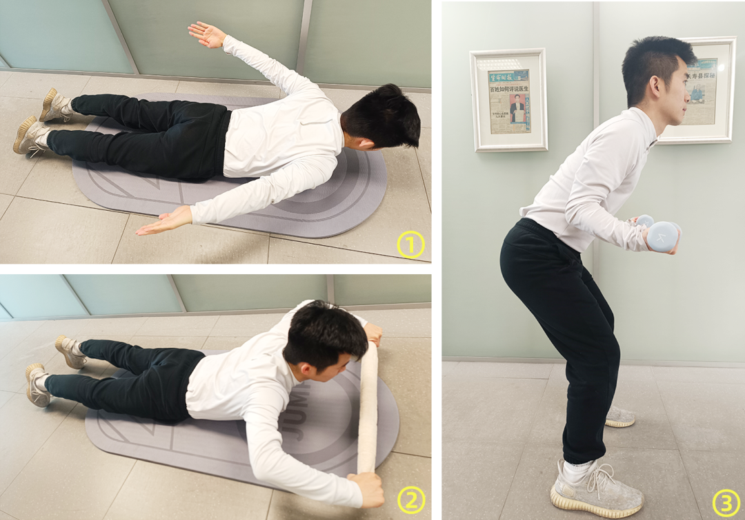 俯卧抻毛巾:俯身趴姿,腹部、髖部及大腿貼地;雙腿向後伸直,雙手拉住毛巾兩端,背部發力向上挺直,同時將毛巾拉直並向上舉過頭頂,能感受到肩胛骨有充分打開之感,停留2~3秒緩慢還原。