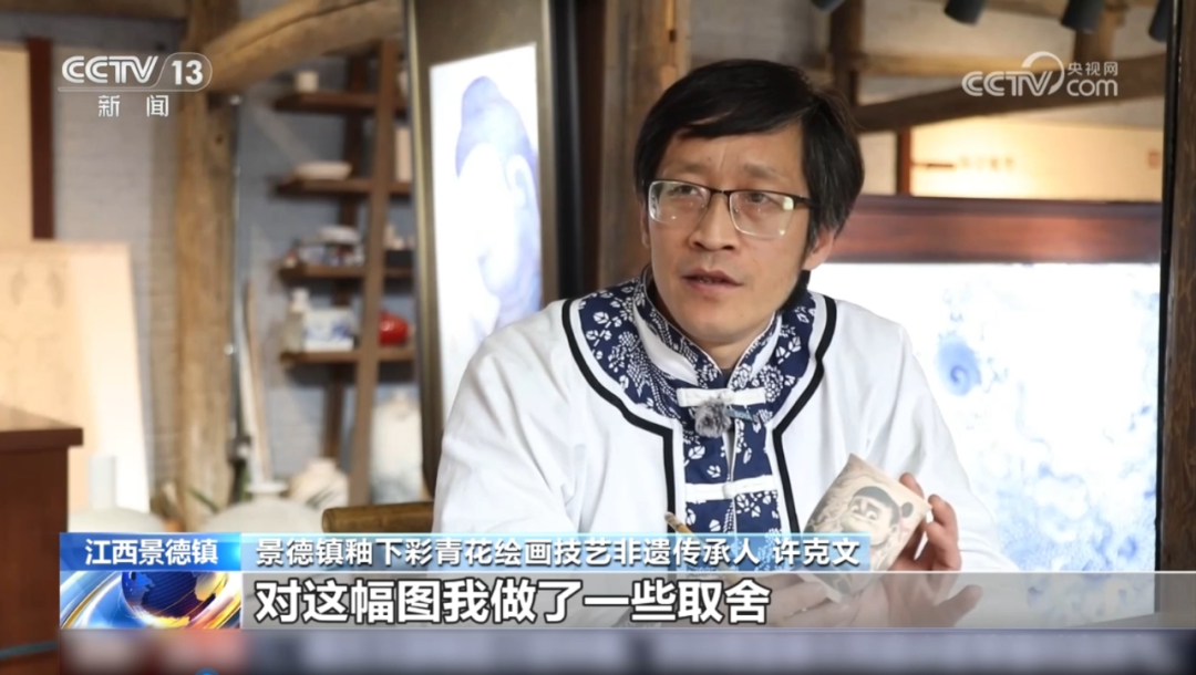 景德鎮釉下彩青花繪畫技藝非遺傳承人許克文説:“這個作品靈感來自於《哪吒》這部電影,對這幅圖我做了一些取捨,後續加入了個人的一些原創,這契合我們陶瓷文化的傳承與創新。”