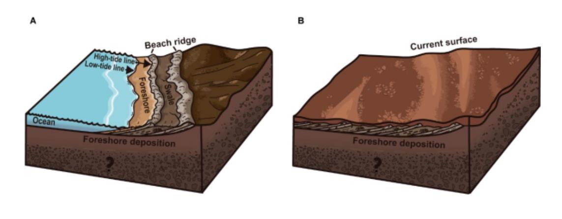 該研究通過分析“祝融號”雷達低頻通道實測數據,在火星車沿途地表以下10米至35米深度範圍內識別出76個地下傾斜反射體。這些發射體空間分佈廣泛且均勻,覆蓋範圍超過1.3公里,所有反射體均呈現向北方低地方向傾斜的特徵,傾角介於6°至20°之間,平均傾角為14.5°,且在相同位置的不同深度可觀測到多個平行分佈的反射體。這些層理結構與地球沿海沉積物的雷達成像結果相似,其一致性和物理特性排除了風成沙堆、熔岩管道或河流沖積等其他成因。這些沉積物的大規模存在表明,風浪驅動的沿岸輸送為海岸線提供了穩定的泥沙淨流入並形成了海岸線前積層。這種結構只有在持久穩定的大型水體環境中才能形成,而非僅僅是局部和短暫的融水現象。