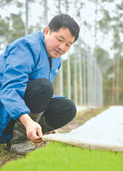 圖為陳超在育秧基地查看秧苗長勢。