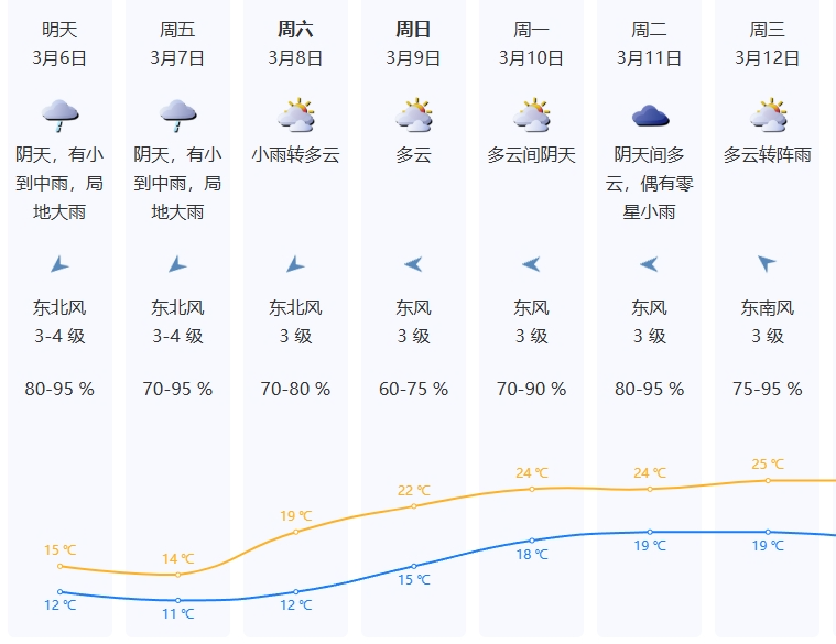 預計6-7日間歇性小雨略有頻密,日温差小,體感陰冷。