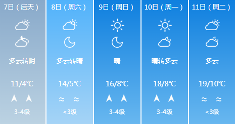 明天夜間到7日多雲,北風轉南風2~3級,最低氣温濟陽區、萊蕪區、鋼城區、商河縣、南山區、起步區-1℃左右,市區及其他區縣2℃左右,最高氣温11℃左右。