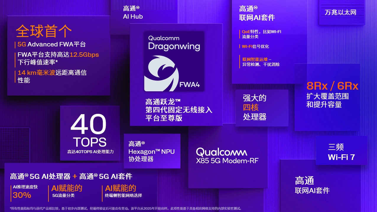 在MWC首日,高通宣佈推出了高通躍龍第四代固定無線接入平台至尊版,這是全球首款5G Advanced FWA平台,也是其高通躍龍全新產品品牌的首款新產品。該平台搭載了高通X85 5G調制解調器及射頻,下行速率高達12.5Gbps,為5G寬帶性能樹立了新標杆。據悉,這款平台集成了全面的AI增強特性,集成強大的網絡邊緣側AI協處理器,NPU處理能力高達40TOPS。這優化了跨5G寬帶和Wi-Fi的無線連接,同時釋放了生成式AI的強大能力,覆蓋更多設備,實現更可靠、更協調的用户體驗。