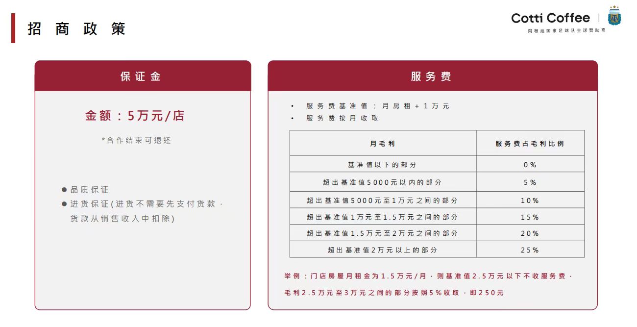 在傳統加盟模式中,高昂加盟費和固定服務費往往導致加盟商在前期面臨較大的虧損壓力,從而阻礙了品牌的擴張。庫迪咖啡深刻認識到這一問題,並決定對傳統模式進行革新。庫迪咖啡的聯營模式,初期不收取任何加盟費或品牌使用費等固定費用,直到門店開業並有一定利潤後才開始按階梯比例收取服務費。