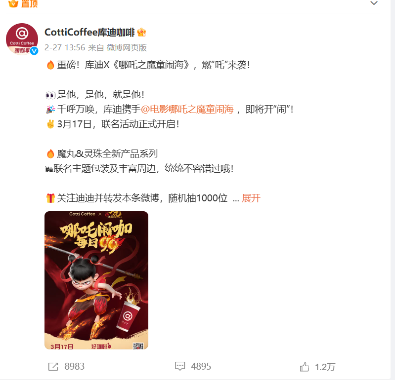 庫迪咖啡首席策略官李穎波表示,“我們希望通過與《哪吒2》的聯名,藉助國潮文化的影響力,為‘高性價比咖啡’的定位賦能,吸引更多年輕消費者,尤其是對咖啡相對陌生的羣體。” 這種文化與品牌的深度融合,不僅能提升品牌在年輕羣體中的知名度,還能賦予品牌獨特的文化內涵。