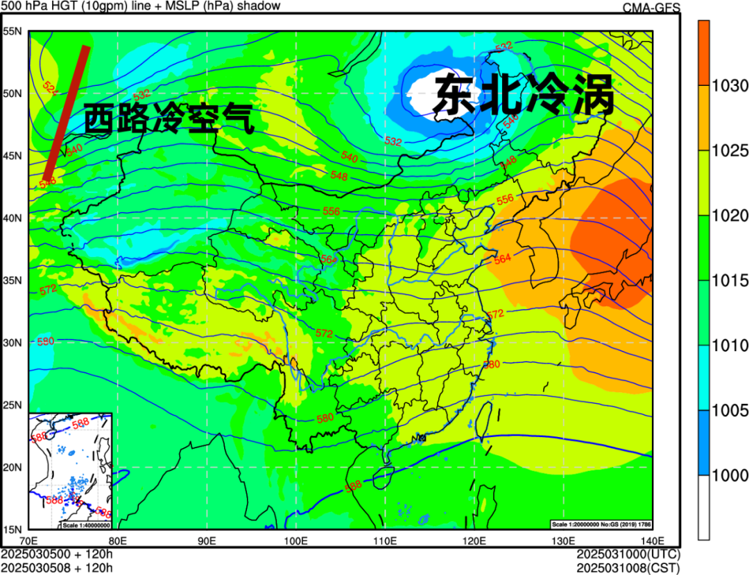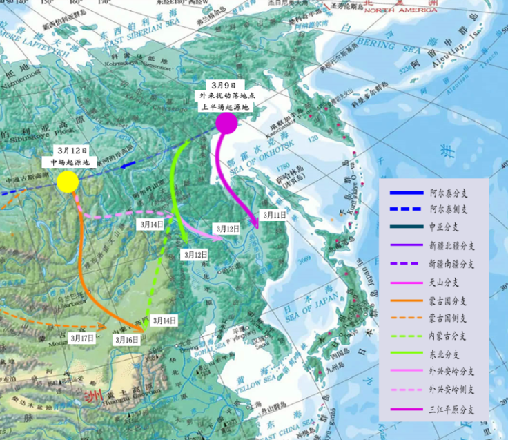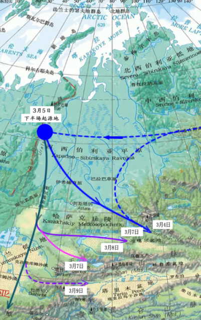 從下圖中我們可以看出,東路冷空氣的出發點已經是直接出現在了鄂霍次克海的北部沿海海域一帶,距離我國東北境內已經是非常接近了,所以由此形成的大風將會得到明顯增強。
