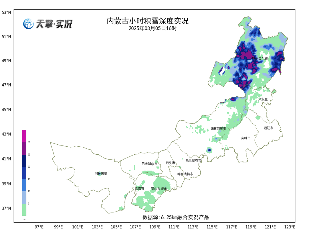 在剛剛過去的一輪雨雪天氣中,內蒙古多地雖然出現明顯降雪,但由於氣温偏高,雪花落地很快融化,全區積雪面積並沒有增多,而呼倫貝爾由於天氣依然寒冷,積雪深度稍有增長。