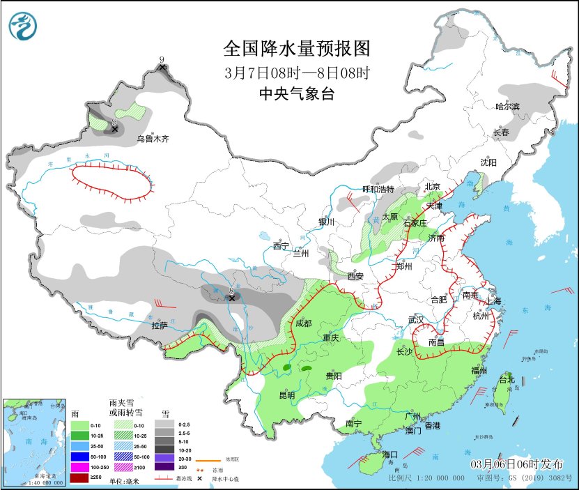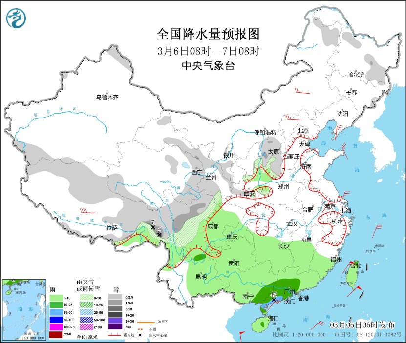 *3月6日08時至7日08時,*西藏北部和東部、青海東部、川西高原、甘肅西部和南部、寧夏、陝西中部和南部、山西、內蒙古東北部、黑龍江西部和東南部等地部分地區有小雪或雨夾雪,其中,西藏東部、川西高原、山西北部等地部分地區有中到大雪(5~9毫米)。西南地區大部、江南南部和西部、華南、台灣島等地部分地區有小到中雨,其中,廣東西南部的部分地區有大雨(25~45毫米)。內蒙古中部、河北北部、遼東半島、山東半島東部、江蘇南部等地部分地區有4~6級風;東海、台灣海峽、巴士海峽、南海北部等海域有6~8級風(見圖1)。