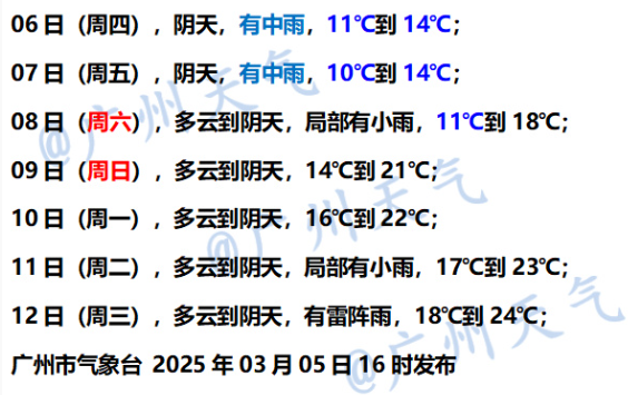 廣州市氣象台預計,受冷空氣補充影響,3月6日—7日廣州維持陰雨天氣,氣温繼續小幅下降,3月7日早晨出現本次降温過程最低氣温,僅10℃左右。