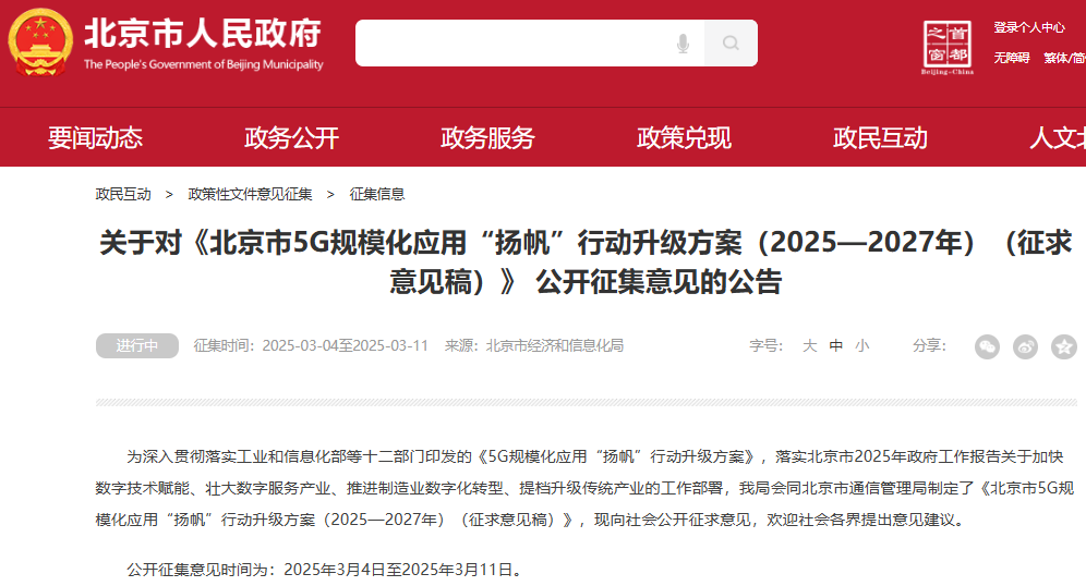 【環球網財經綜合報道】在數字經濟的浪潮中,北京市正着手繪製5G產業發展的新藍圖。近日,北京市經濟和信息化局公佈了《北京市5G規模化應用“揚帆”行動升級方案(2025—2027年)》的徵求意見稿,是為全面增強5G產業支撐力、網絡服務力和生態協同力,推動新型工業化高質量發展,併為6G應用的探索和先行先試奠定基礎。