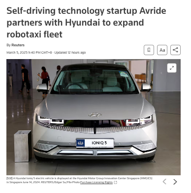 【環球網智駕綜合報道】3月6日消息,據路透社報道,自動駕駛技術公司Avride與韓國汽車製造商現代汽車週三宣佈,雙方已簽署協議,將共同開發和運營自動駕駛汽車,並擴大自動駕駛出租車車隊。總部位於得克薩斯州的Avride計劃在今年將其車隊擴展至100輛現代IONIQ 5汽車,並計劃在2026年進一步擴大規模,以進入新市場並增強其自動駕駛系統。
