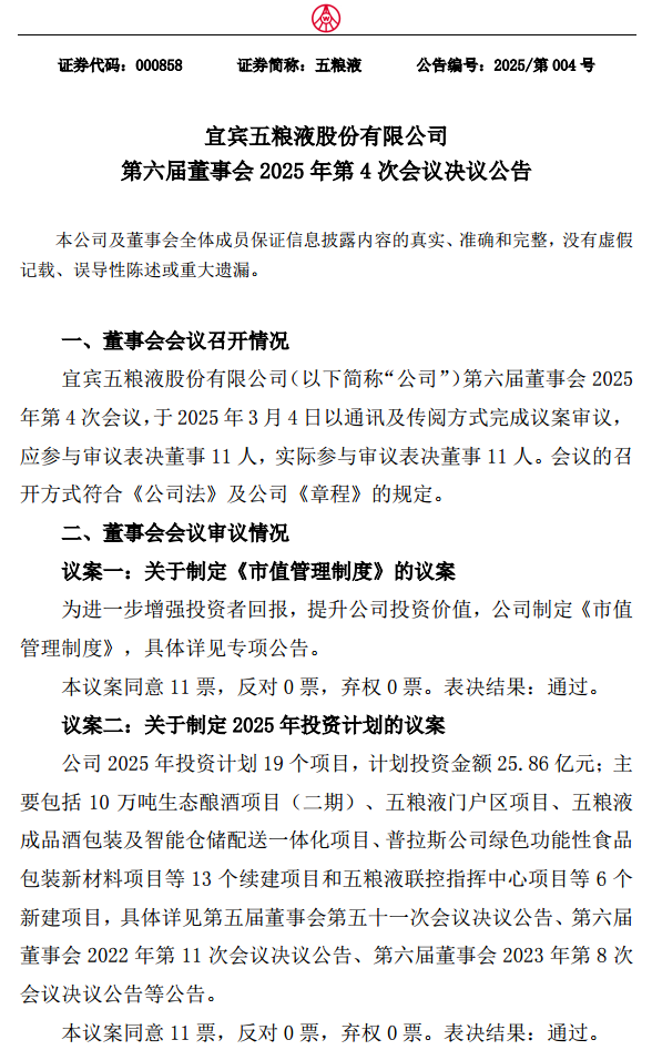 【環球網消費綜合報道】白酒企業五糧液(000858)動作頻頻,3月6日,公司公告了一系列重大投資計劃。據悉,五糧液董事會會議於3月4日審議通過了四個議案,涉及公司市值管理制度、2025年投資計劃以及幫扶工作計劃等。其中,2025年計劃投資金額高達25.86億元,共涉及19個項目。