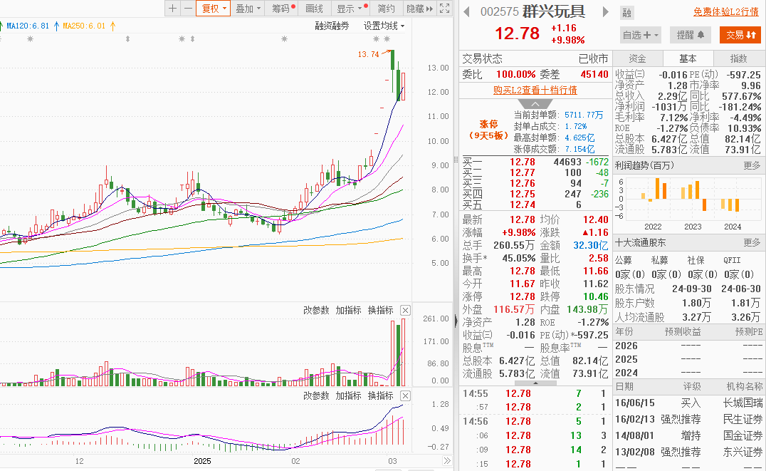 截至3月6日收盤,羣興玩具股價報12.78元,漲跌幅為9.98%,成交額達32.3億元,換手率高達45.05%,顯示出市場對其重組動向的高度關注。(文馨)