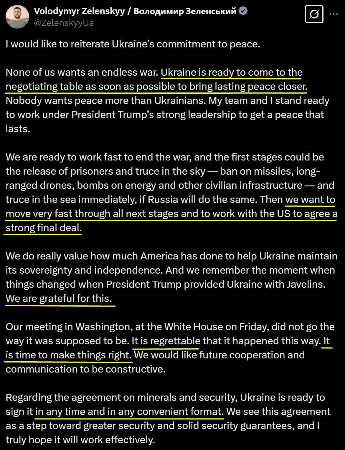 澤連斯基4日當天在社交媒體上發文稱,烏方對美國和特朗普幫助烏克蘭維持主權和獨立以及向烏提供軍事援助表示感謝,他對日前在美國白宮的會晤未能“按照預期方式進行”感到遺憾。他説,現在是糾正錯誤的時候了,烏方希望接下來的合作和溝通具有建設性。