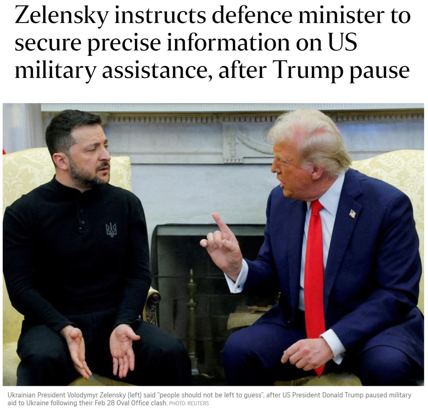 對於美國暫停對烏軍事援助一事,澤連斯基稱,他已經指示烏克蘭國防部長、情報部門負責人和外交官員與美國同行進行聯繫以獲取官方信息,“不應該讓人們去猜測”。