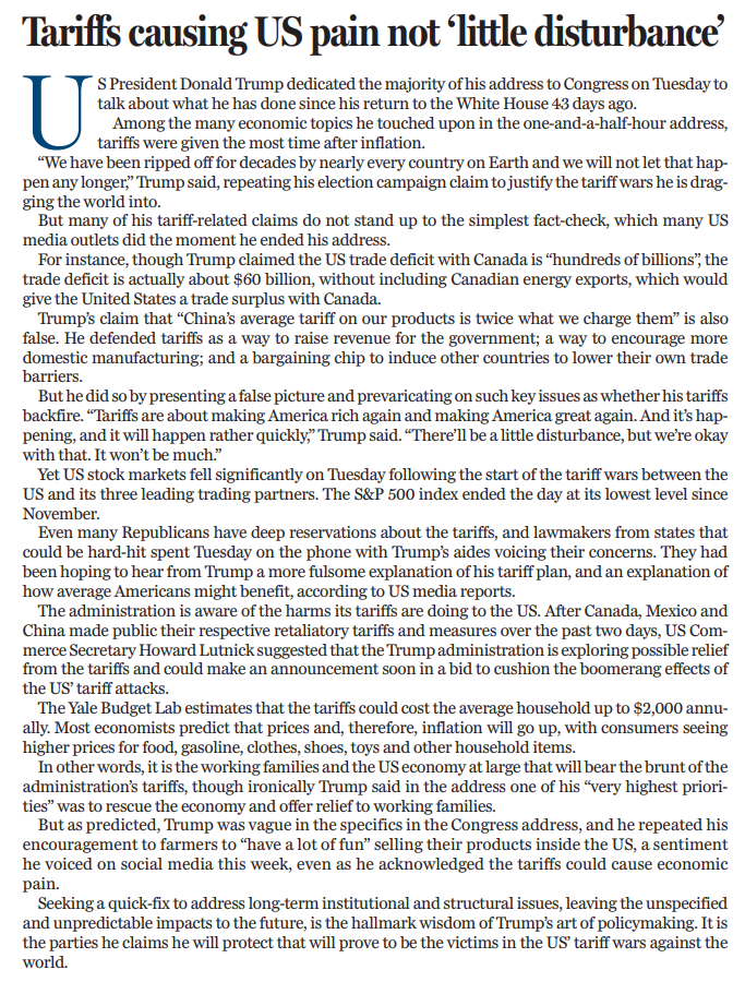 在這場長達一個半小時的演講中,經濟話題佔據了相當篇幅,而關税問題成為僅次於通脹的焦點議題。“幾十年來,我們幾乎被世界上所有國家佔便宜,如今這種情況不會再發生!”特朗普宣稱。他沿用了競選時的論調,試圖為自己挑起的關税戰辯護。