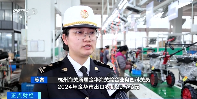 *杭州海關所屬金華海關綜合業務四科關員 陳睿:*據金華海關統計,2024年金華市出口農機29.7億元,同比增長53.8%,主要出口至歐美和東南亞地區。我們提供了“7×24小時”預約通關模式,幫助企業能夠隨報隨檢,提高查驗效率。