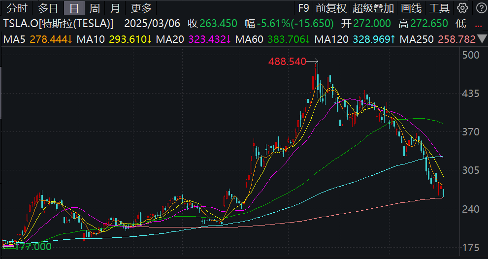 【環球網財經綜合報道】北京時間3月7日凌晨,美國三大股指全線收跌,道指跌0.99%報42579.08點,標普500指數跌1.78%報5738.52點,納指跌2.61%報18069.26點。其中英偉達跌超5%、特斯拉跌超5%。備受市場關注的是,2月1日至3月5日期間,特斯拉股價跌幅超過31%,市值蒸發超4000億美元。