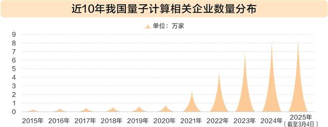 企查查數據顯示,我國量子計算相關企業存量從2015年末的0.27萬家逐年穩定增加,至2020年末達0.83萬家;2021年開始,我國量子計算相關企業存量呈現指數級躍增,分別於2021年、2023年跨越2萬家、5萬家門檻。截至2025年3月4日,我國現存8.56萬家量子計算相關企業,較2020年增長超10倍。