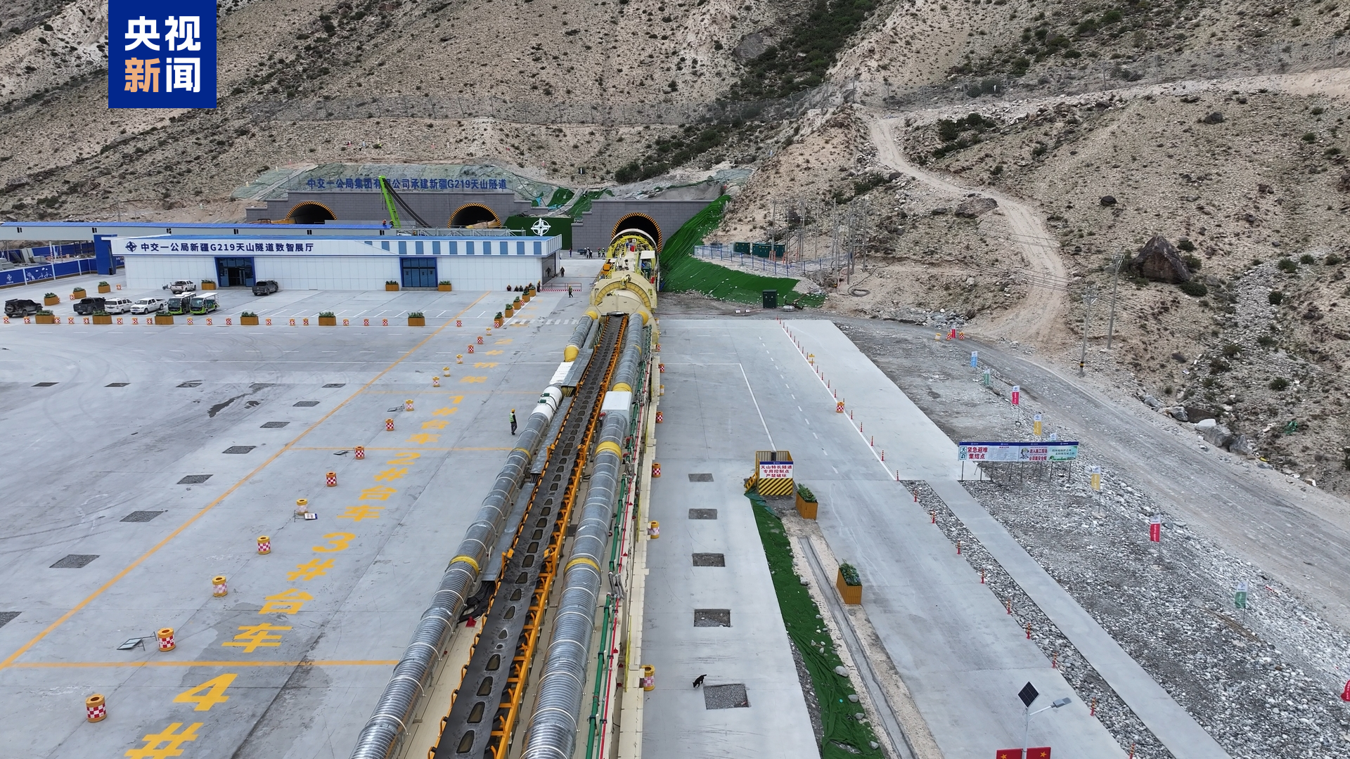 TBM硬巖掘進機是一個長235米、重1800噸的巨型掘進機械。2024年4月底在江蘇常熟下線。部件拆分成幾十萬個,用近百輛運輸車跋涉萬里運送到昭温公路西天山特長隧道建設現場,經過近三個月的安裝調試,2024年7月正式掘進。它就像一個巨大的鑽頭,共有61把巨大的刀片,最重的400多公斤,最輕的也有300多公斤。鑽頭伸進堅硬的山體,一邊鑽動,一邊通過特製的履帶向外輸送渣石。不僅提高了施工效率,還最大程度地保護了生態環境。傳統的“鑽爆法”施工,1年只能推進一公里多,而這台TBM的功效是“鑽爆法”施工的三至五倍,先後創造了單日進尺45.7米、月掘進821米的世界紀錄。