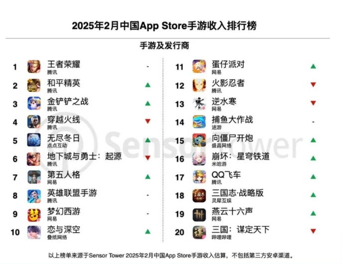 騰訊《王者榮耀》、《和平精英》、《金剷剷之戰》和《穿越火線》等4款遊戲包攬中國App Store手遊收入榜1至4名。2月《王者榮耀》仍然保持穩定的盈利能力,“蒼”、“西施”和“狄仁傑”等新皮膚的上線,助力該遊戲在中國iOS市場收入提升8%,蟬聯本期收入冠軍。在情人節等活動的帶動下,《無盡冬日》本期收入環比提升23%,使得中國iOS市場收入再次超越美國。隨着3.0下半卡池新角色“阿格萊雅”的上線,以及全新3.1版本“門扉之啓,王座之終”的推出,米哈遊《崩壞:星穹鐵道》本期收入環比提升11%,重回榜單第16名。(思瀚)