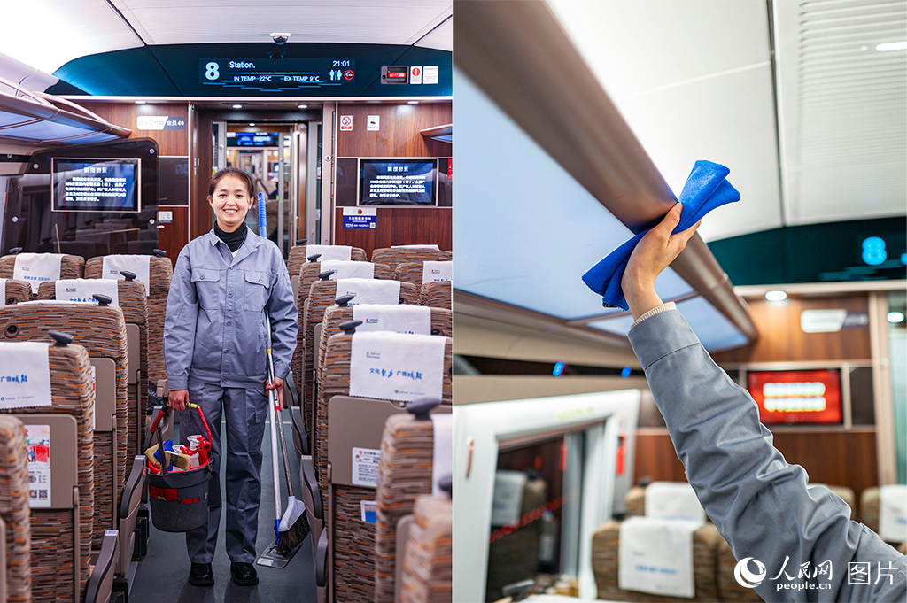 今年31歲的徐丹丹是中國鐵路上海局集團公司下屬華鐵旅服公司的一名列車保潔員,從事高鐵清潔工作9年。每當夜幕降臨,列車緩緩入庫“休整”,徐丹丹和同事們便迅速投身忙碌的工作之中。無論是日常還是春運高峯,從清潔車窗玻璃到擦拭小桌板,車內的每一處細節,她們都仔細清潔。正是因為有着許許多多像徐丹丹這樣“高鐵美容師”的默默付出,每一列高鐵列車才能以窗明几淨、整潔舒適的最佳狀態,迎接五湖四海的旅客。