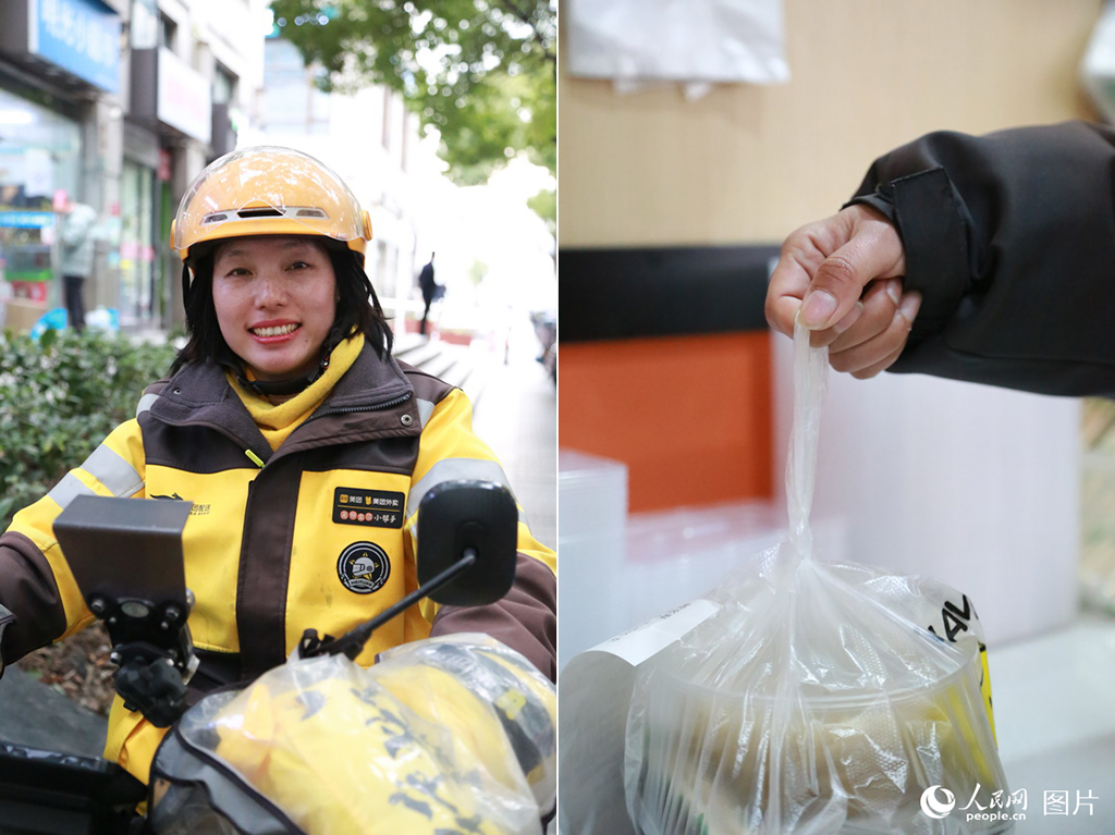 34歲的孫精精,去年10月來到上海做騎手,在老騎手的指導下,單量和收入逐步提高,一個月已經能跑到1200單,收入達到8000多元。她説:“做騎手這一行能讓我得到更多與人溝通的機會,有助於我更好融入社會。”