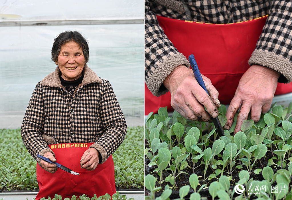 侯小專正在給嫩綠的花菜種苗精心間苗。人民網記者 王玉興攝