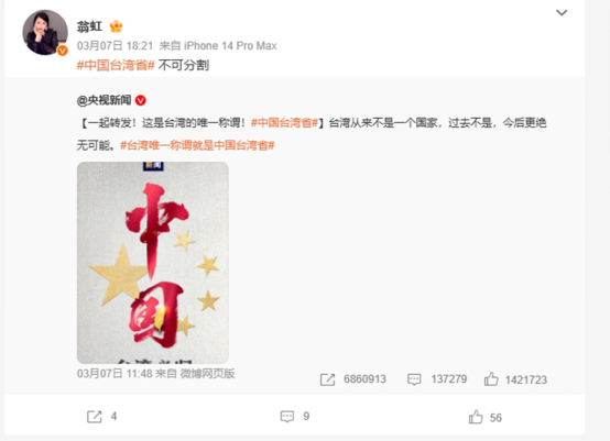 香港女星翁虹寫道:“中國台灣省,不可分割”;何超蓮表態説:“中國台灣省,台灣從來不是一個國家”。