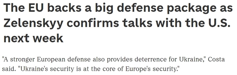 歐洲理事會主席科斯塔表示,更強大的歐洲防務也為烏克蘭提供了威懾力量,而“烏克蘭的安全是歐洲安全的核心所在”。